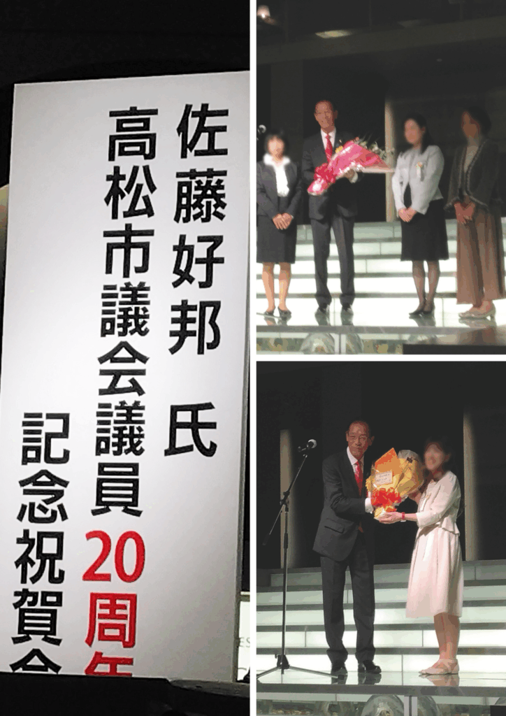 2025年11月16日、高松市香川町の「ザ・チェルシー」にて、佐藤好邦高松市議会議員の20周年記念祝賀会が盛大に開催されました。