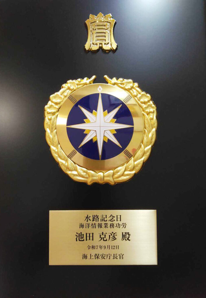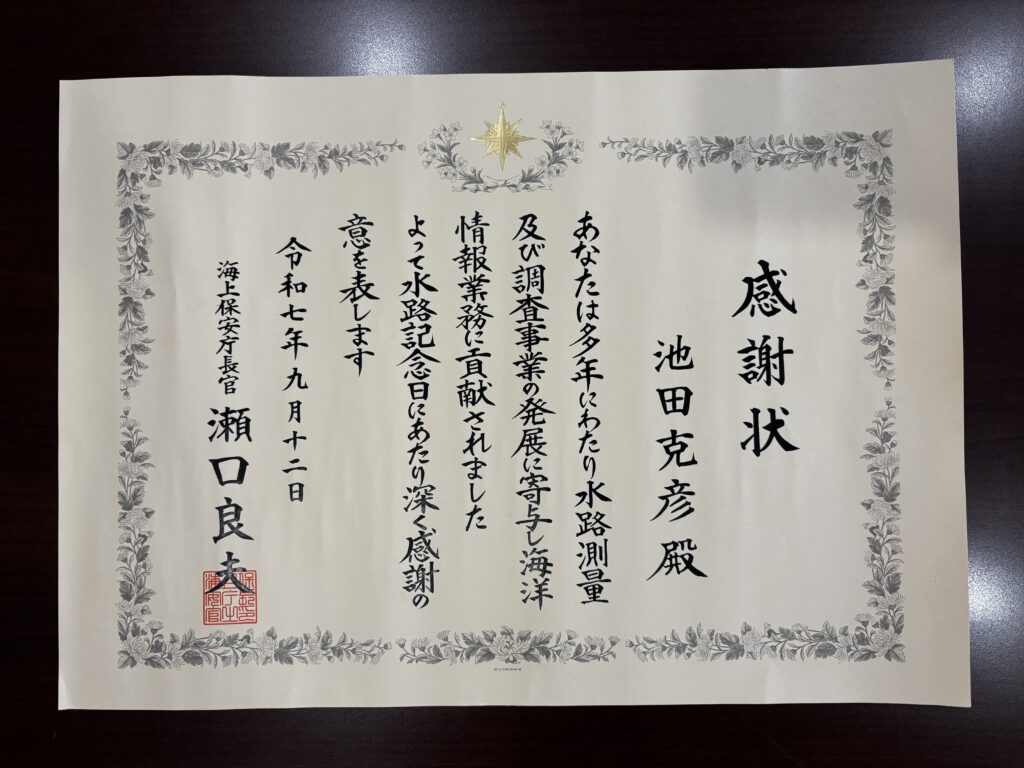 弊社社長池田は、水路記念日に海洋情報業務への功績が認められ、瀬口海上保安庁長官から感謝状を受賞しました。